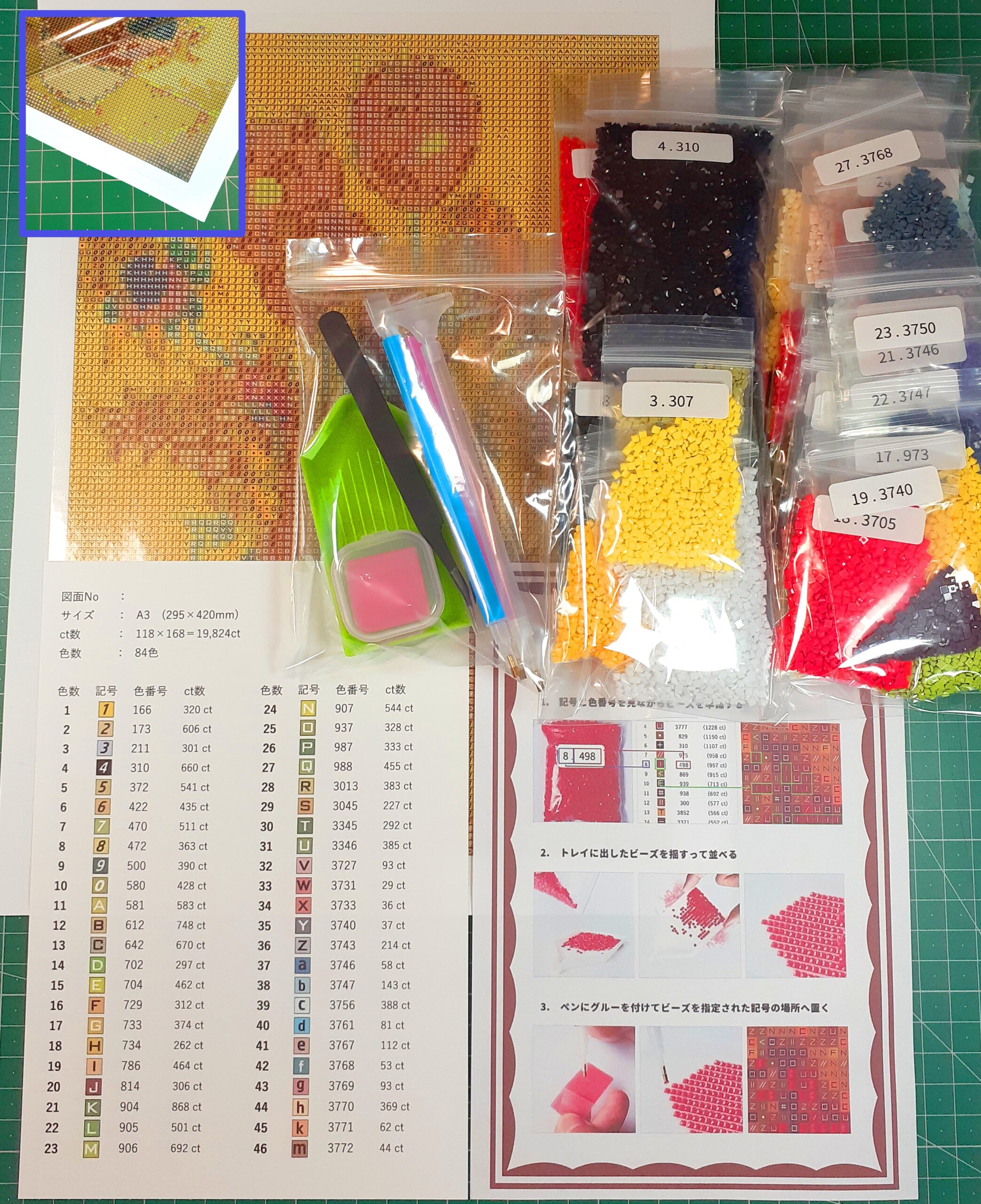 商品説明、記号、色番号、使用数が記載されています。